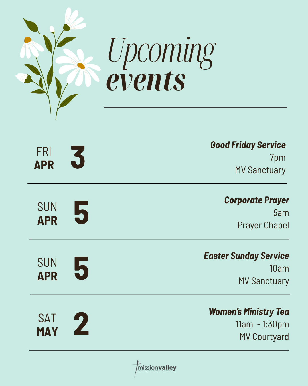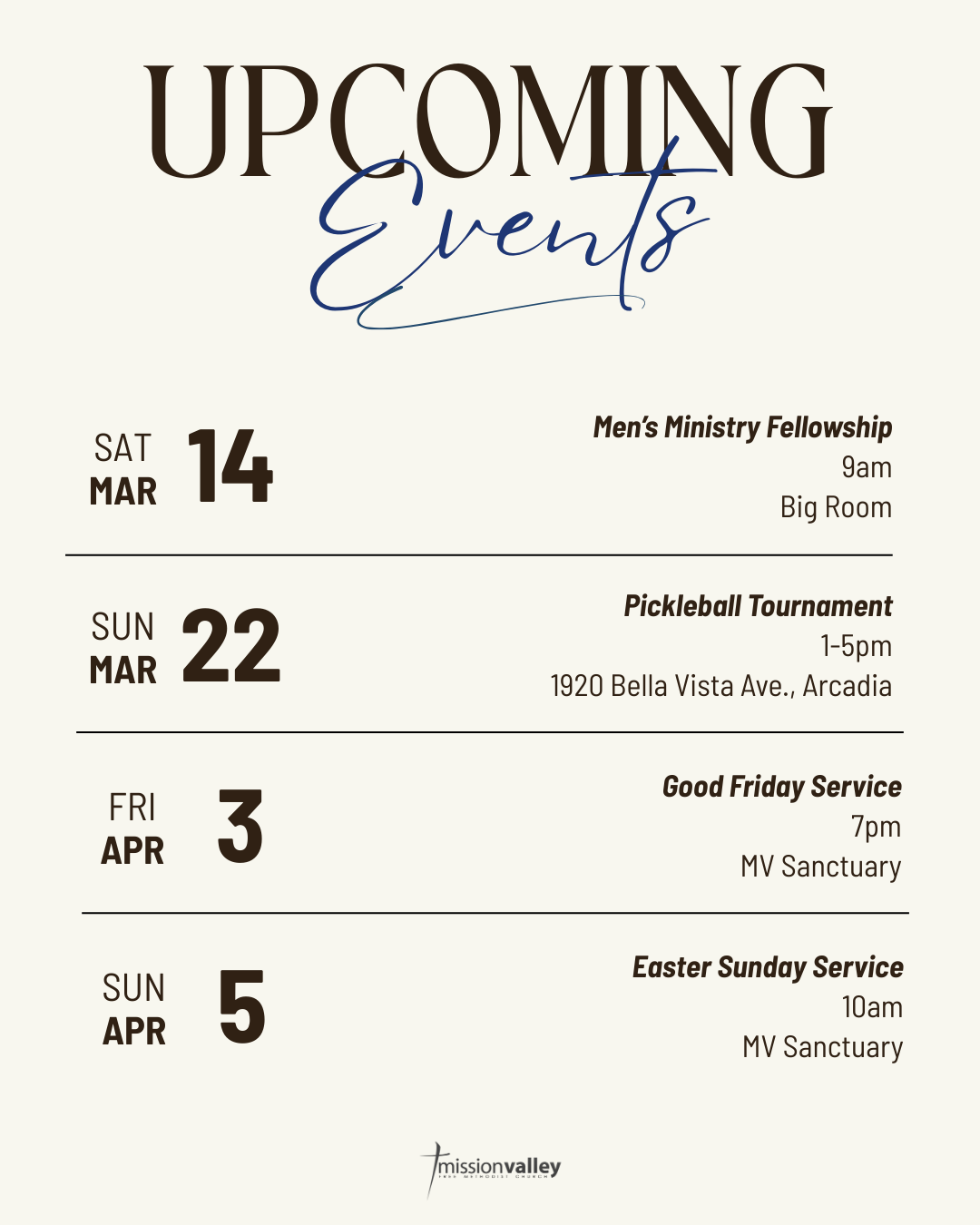 On Good Friday, April 3rd at 7:00 PM, we gather to remember the profound sacrifice of Jesus Christ. All are welcome to join us for this solemn and powerful service. For more information, please contact Mari Ito. (mvadmin@mvfmc.org)